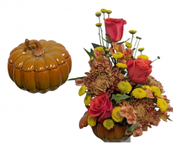 Nothing warms your heart and soul like a slice of Pumpkin pie. A beautiful Pumpkin keepsake ceramic container filled with Autumn colors of roses, cremon mums, alstromeria and buttons. Send a flower slice of pie during the Autumn season. Perfect for home, to send to the hospital or care facility , the home for thinking of you or Happy Thanksgiving. The Pumpkin makes a wonderful keepsake to keep TREATS inside and hidden..